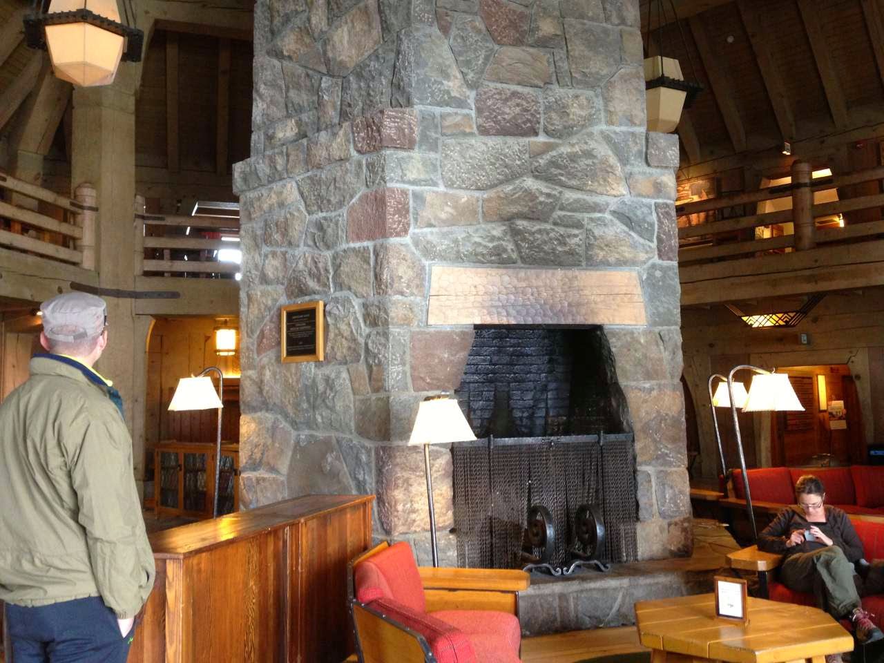 After a wonderful lunch we headed south for Mount Hood to see Timberline Lodge, made famous in the movie "the shining" staring Jack Nicholson. All the exterior shots in the movie were of Timberline Lodge, the interior shots in the movie were done on a sound stage and look nothing like the interior of the real lodge. The real lodge is constructed from massive rough hewn timbers and is very rustic. The center fireplace is a three stories tall hexagonal shape, and the huge vertical timbers are also hexagonal. Pat is standing in front of one of the timbers in the pictures. Still lots of snow up there as you can see. Mount Hood's summit was covered in clouds the entire time except for a two minute window when Pat snapped the pictures.